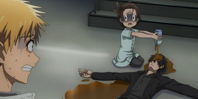 At first, he seems like he's friendlier than he looks when he goes out of his way to save Inori from a bad fall. We get a funny couple of minutes where Inori thinks she might have done some murders as Tsukasa walks in on her trying to restore him to life by pouring tea on him only for Tsukasa to slip on it and become her next victim. Hilarious as this all is, the mood changes when Inori tries to get Jun to pass on her message, and Inori makes it clear that her goal is to someday skate with and defeat Hikaru. Upon hearing this, he tells Inori that she doesn't have what it takes to stack up against Hikaru, and since Tsukasa recognizes Jun as a former Olympic-level skater, those words carry a lot of weight. However, in Jun's mind, Inori proclaiming that she has what it takes to beat Hikaru is the same as saying she could defeat him. Given Tsukasa's hangups about his own skating career, there was a brief moment where I thought he'd let that get to him and fail to back up Inori here. Thankfully, Tsukasa quickly realizes that this is a moment where he needs to assert himself, and makes it clear to both Inori and Jun that he's ready to dedicate the rest of his life to ensuring that Inori will someday rise to Hikaru's level. It's a nice little declaration of war.