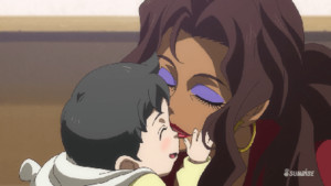 Now contrast that with the saccharine message of the episode: you can choose your family, and Tekkadan is a family. I noticed last episode that Naze's pilots and crew are entirely female, something I jokingly referred to as a harem. So when Naze comes out and directly defines his crew as “my harem,” I was pretty taken aback. We've gotten so used to dancing around the harem trope in anime that it's surprising to actually see it acknowledged, with such forwardness that it makes Kudelia blush. Still, Kudelia and Atra can't resist meeting the youngest members of that family, the babies in the nursery who all count Naze as a father. (No orphans on his ship yet!) This portrait of unusual but sweet domesticity parallels Naze's revelation to Orga: “That's not what you call comrades, that's… family.” The Tekkadan is just like Naze's space bigamy!
