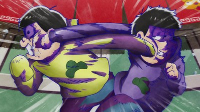 The following segment shows Ichimatsu and Jyushimatsu so afraid of their "happiness debt" inflating that they subsequently inflict the required "misfortune payback" on each other to stay ahead of karmic retribution for the sin of being too happy. From Ichimatsu's cute and comparably harmless jump into the pond to make up for catching too many fish, Mr. Osomatsu ratchets up the scale of physical and psychological violence until our NEETs reach the stage of ultimate punishment: walking through crowded places like Shibuya Crossing and Takeshita-dori, packed with normal functioning adults wearing actual shoes who care very little about the sweating, shivering siblings. Despite the considerable pains they went through to make sure their blessed yakiniku was not taken away from them, karma proves to be a bitch by simply not existing. More yakiniku for the other Matsus, who also couldn't care less about their toasted brothers. Punishment! is Mr. Osomatsu's sharpest segment in a while, from its impeccable timing for escalation to how insanely excited the brothers get about what would only be cause for minor ordinary happiness to a normal adult.