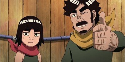 Guy's father, Might Dai (seriously, that's his name), is as overdramatic and gung-ho as Guy and Lee, skintight green bodysuit and all. The overall theme of the segment, that perseverance and hard work pay off for those not blessed with talent, is nothing new. It's Rock Lee's creed and has been a focal part of many stories featuring ol' "Bushy Brows." However, it's amusing to see familiar faces from Guy and Kakashi's generation as children and recognize how very alike Guy and Lee are. (Not that we didn't know that already.)