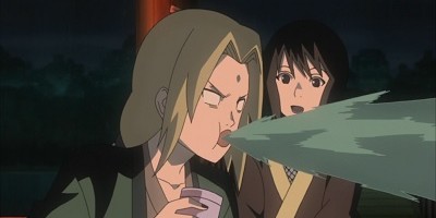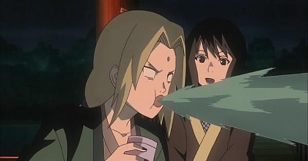 This week's episode opens with Shizune bringing dinner to a thoroughly-engrossed Tsunade, who finally seems to be taking issue with Jiraiya's prose and narrative choices. While I share her disdain for the material, I'm a little confused by the nature of her concerns. At one point, she exclaims, "Just because it's a novel doesn't mean you can change things!" Forgive my insolence, Lord Fifth, but isn't a novel the perfect medium for changing things? As far as I know, Jiraiya isn't trying to pass this garbage off as a true story. None of what took place prior to this chapter constituted "real-life" events, so why is she getting annoyed now?
