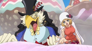 Anyway, this episode suffers from a lack of polish. The first half continues to be action-heavy (still adding embellishments on top of the original manga material) but there's a notable lack of detail in most of the drawings. There manage to be some stand-out moments of animation sandwiched between the endless reaction shots of characters hanging out on the sidelines, but it's an awkward mishmash of good and bad, both aesthetically and pacing-wise. Right up until the big scenery change at the end, this episode gets bogged down by a lot of meaningless noise. If you want to see the Vinsmokes and the non-Katakuri members of Big Mom's family get some more time to shine, the anime has you covered, but the content can still get boring.