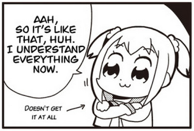 I think Pop Team Epic is ultimately most categorizable as anti-humor, a genre of comedy(?) that derives its humor from the very absurdity of trying to find meaning in its madness. As a general rule, humor derives its strength from the unexpected. In conventional comedy, this comes from playing around with existing lines of ambiguity. For example, that old “Who's on First?” routine was funny because it messed with two ways of interpreting the word “who” for an extended period of time. That punny ambiguity is the joke's pivot point, but it's also the source of the sense it makes. Now, however, everyone knows how these sorts of puns work, so you have to come up with something super-crazy-unexpected to get people to laugh – for example, you might give up on making sense at all.