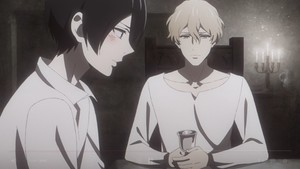 This episode also confirms that the art and animation really do look better when action isn't the main focus. (That's potentially a bit of an issue, since according to Kathryn Harkup in her book Death by Shakespeare: Snakebites, Stabbings, and Broken Hearts, this cycle of plays has the most swordfights in all Shakespeare.) The juxtaposition of black and white is particularly well-used here, with Henry practically glowing angelically against Richard's gloom. It highlights the differences in their personalities, yes, but it also works with Richard's own perception of them – his demonic darkness versus the light of the love Henry offers. There are also slightly fewer stills and faceless scenes this week, but the use of painted still shots of Henry and Richard in the river as Edward tells Elizabeth a story about inescapable fate works well.