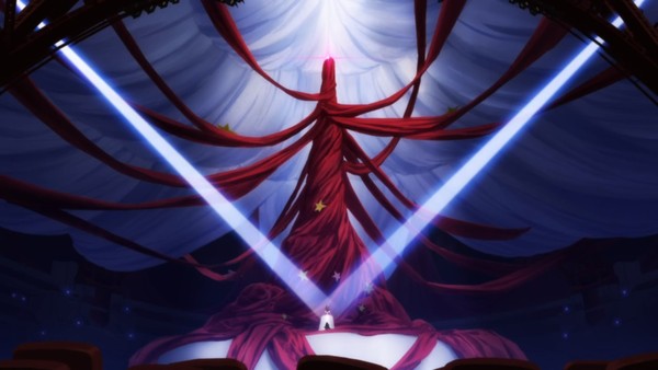 However, Revue Starlight truly shines as the top star of the summer season when it sheds the pretenses of reality. Karen's daydream about Tokyo Tower turns into a nightmare as she's pushed off by the person who used to be her closest friend, and the show starts to reveal its hand as more than just a slice of life about a performance art school. Her mysteriously fraught relationship with Hikari leads her down the elevator into the secret and surreal Underground Theater. The animators do some remarkable work imbuing both passion and fury into the girls' movements as Hikari and Junna clash on the stage. The storyboarding also consistently highlights the entire theatrical aesthetic. Curtains drape and billow dramatically, star props rise up and down from the rafters, and spotlights swing dramatically from player to player as swords spark and arrows fly. Beneath all of this, Junna sings melodramatically about pursuing her dreams even through the end of the world. It feels like watching a carefully choreographed production full of the larger-than-life emotions that attract people to the theater in the first place. Karen watches from the audience, because she hasn't been chosen, but she also can't stand idly by while Junna stands poised to defeat Hikari. So in a move mirroring her nightmare, she jumps into the fray. The subsequent 45-second transformation sequence filled with precise mechanical animation is where Ikuhara's influence on Furukawa is at its most blatant, standing alongside the Witches 5 laboratory in Sailor Moon S or the more thematically relevant metamorphosis of Utena into a car in her movie. Karen is reborn as a swashbuckling Stage Girl and swiftly dispatches Junna, which makes Hikari furious. Karen, like any good protagonist, does this without thinking because she loves Hikari and wants to be the lead alongside her, both of them standing tall at position zero. But that isn't how these Auditions work. Karen stands alone.