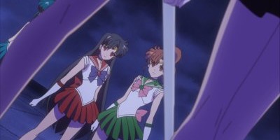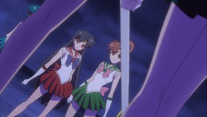 Of course, all of this is happening at the expense of developing the other characters, and Ami, Rei, Makoto, and Minako have all been reduced to their fighting strengths again. This makes it less troubling than it should be when the latest (and last) member of the Witches 5 uses her powers to make the two groups of Guardians fall prey to their annoyance and jealousy of each other and begin to fight. The scene is also rendered less impressive by the fact that making their pupils red just looks like someone took a bad photograph of the group rather than screaming “under evil mind control.” Fortunately that bit of storyline will be quickly wrapped up next week. As I said before, the episode ends on a cliffhanger, with Sailor Moon on the verge of new powers and a tantalizing glimpse of some purple boots in the preview. Don't you love that this has become a show we can look forward to?