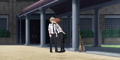 To begin, the twilight lighting that bathes the opening scene makes Fuyumura's hero moment where she rescues SANDA from a classroom of murderous misfits all the more impactful. While SANDA outright calls her a “badass,” the scene does more than enough to make her feel like one, so his comment more reinforces this characterization than invents it. This also creates a nice parallel with Fuyumura's more awkward, and similarly lit, scene with Ono later in the episode. SANDA makes Fuyumura feel hyper competitive in some moments, while utterly incompetent in other, more intimate settings, and it really drives home how Fuyumura's character is an exploration of how developing in different ways and at different rates as a young person can cause internal and external friction.