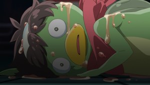 Zombies: If normal humans walk around with their desires locked safely in their shirikodama (even if it sometimes leaks out into Kappazon boxes), what happens if you forcibly suck those desires out of them? Apparently you get a gigantic zombie who hoards the desires of others to refill their shirikodama and keep the secrets inside it from leaking out. Since the zombification victims must first be arrested and interrogated, I think it's safe to interpret this as a metaphor for how traumatizing it can be to lose the anonymity and safety that social media initially offers, since it can be ripped away at any time by bad actors, faulty systems, or even the victim "turning themselves in" out of shame. It's obvious that the cardboard-zombie hasn't actually lost his sense of desire, he's just lost his boxes—the safe outlet he was channeling that desire into. Now that he's been privately castigated (and metaphorically castrated, which might explain his submissive pose and the oddly vaginal shape of his zombie-taint), he's become desperate to find another outlet for his "illegal feelings" before the real secret behind them is exposed to the world. Tragically, when the subtext for his actions is violently exposed, he loses all sense of desire or self and becomes an invisible ghost to human and kappa alike. But the saddest moment comes when Kazuki yells "It's your fault for having a secret that can get you in trouble!" Kazuki is ordinarily such a meek and gentle kid that this accusation seems strange, but perhaps the person he's being hard on is really himself.