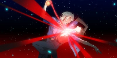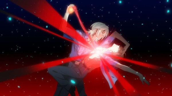 Once their victim's box reaches Skytree's lower ring, it drops into a pool of zero-gravity zombie-water, a dark dead blue against the red of squashed human lives and the white of sterile machinery. As the otters continue to sing and dance about extracting all human desire into one homogeneous existence, the pressure inside the zombie-water crushes all desire out of the victim in a bloody show, to be sucked up by the unfeeling machine at the heart of Skytree. Now drained of red desire, the victim's remains messily reform into a cold blue zombie state, while the mysterious creature feeding off his desire (who has familiar saucer-like eyes) watches the two otters perform their dance's climax. Reo physically dominates a willing Mabu, reaching into his cold blue body to grab his heart, which has been stopped by some kind of clockwork mechanism, recalling the imagery of slumber and immortality that's been tied to Keppi (and somewhat to Kazuki). When Reo touches Mabu's heart, life and warmth flow back into his body. Reo quickly rips the heart out entirely, now connected to Mabu only by two red strings of fate. They freeze there, posed dramatically in a vast bloody ocean of stolen desires, as the giant cat-zombie they've created sinks lifelessly into—