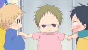 That's definitely not lost on the girls in his class, much to Yuki's chagrin. Apparently Ryuichi and Kamitani are the heartthrobs of their class, in no small part because Ryuichi is so devoted to Kotaro. While they acknowledge that none of them stand a chance with a little brother in the mix, the girls can't deny that they find such parental devotion and kindness incredibly appealing. Only Yuki really seems like she might act on her crush (possibly next week), mostly because Inomata is trying really hard to deny that she has a crush in the first place. Not that Ryuichi is aware of any of this – heck, he didn't even notice that he left work in his apron with a butt covered in stickers courtesy of the toddlers – and that's probably why the other boys in class don't dislike him outright. It's hard to compete with someone who isn't aware that there's a competition.