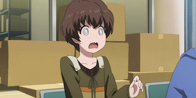 There are also some shenanigans from established characters. Tarou is up to his usual nonsense, but now that he has a position of power, he flaunts it in front of everyone. When he's driving over to one of the artist's houses, he gets so power-drunk that he lectures Satou and Andou on everything up to and including how to drive. They chirp merrily in agreement but avoid him in the backseat, already catching on to his attitude. There's also another fun fantasy moment from Kinoshita, as he imagines himself in Tatiana's uniform while discussing one of her scenes. He can always be counted on to throw himself way too much into the creation process, so he's perfect material for when the show depicts that idea literally.
