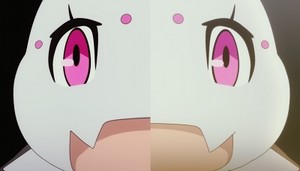 Kumoko has the most straightforward entry this episode. Once again, she is confronted by a daunting new foe (this time a fire-breathing, snake-like monster from a magma pool) and must use every established trick plus a new ability or two to just barely survive and win. Pulling off that feat allows her to level up, gain new skills, and in this case, evolve again – and this time around that means a substantial change in her appearance, with her now having scythelike blades for forearms. As routine as this is becoming (even down to the now-expected joke scenes about how she envisions herself and the gusto with which she chows down on monsters), the bigger development here is the appearance of the first Parallel Mind. (Given what is shown in the opener and closer for the series, more can be presumed to be coming.) She now has one mind to control her body and another to think things through, effectively allowing her to do true multi-tasking. Should be interesting to see what the consequences of this will be.