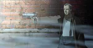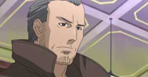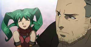 Lets put this into perspective by rewinding back to the opening episode. Solty Rei appeared to present a high-tech cyber-noir thriller that mixed the slow and meditative with the odd bout of anime cheese and eccentricity to a considerable level of success. The lead character, Roy Revant, is a hardened corporate bounty hunter. An obvious archetype, his gruff no-nonsense attitude, single-mindedness and refusal to display any obvious feelings were traits that were nonetheless skilfully implemented and perfectly appropriate for the setting. Then Solty falls into his arms, almost literally, and accidentally saves his life while on the run for her own. This is a contrived coincidence of the most obvious sort, but it did an effective job of bringing the stories of these two characters together and establishing a personal relationship that would work agreeably with Roy's hardened traits.