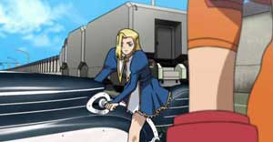 And then it turns out that Solty is more than just human, for reasons other than the size and shape of her ears. Her physical strength is more than enough to deal with large machines designed for battle, and after a trip to the mall on a girlish day out, she ends up with your typical anime super girl costume, despite how much more out of place it inevitably makes her look. This costume itself is problematic for the show, and a convenient marker for giving an example of content focus going away without official leave: as Solty slips from her own cloths into her new super-hero outfit, so the show she stars in slips from its own outfit and starts to put on one that is much more conventional, and one that doesn't have the best colour-coordination, either.
