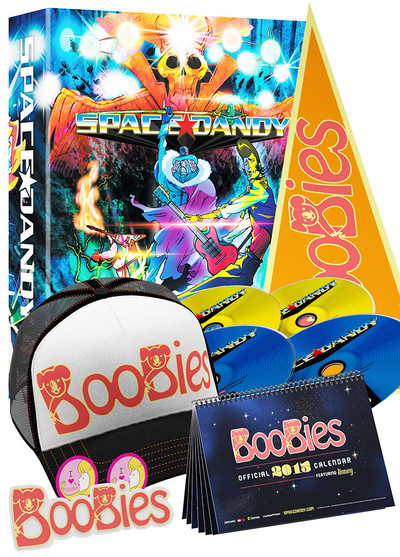 The copy of Space Dandy I've got under the magnifying glass for the purpose of this review is Funimation's “Boobies Gift Box” edition, which is the limited edition (chipboard artbox and art cards) packed inside of a large, colorful box that prominently displays a typical Boobies waitress's derriere. Or is it her décolletage? It's one of the two, anyhow. Inside, there's a panoply of Boobies goodies—a pennant, a calendar, some stickers, and a mesh-back trucker's hat. These physical extras are kind of a wash; they're actually mostly repurposed convention giveaways. The hat's a fun accessory and the calendar would be great if it featured something a little more varied than (surprisingly low-res) screen grabs of Honey from episode 1, but taken together, they certainly don't justify essentially doubling the price of the regular set.