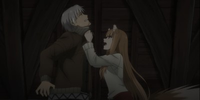 I'd anticipated Holo to be angry with Lawrence about his curt dismissal of her earlier, and apparently, Lawrence anticipated the same. We were both surprised, then, to see Holo much angrier with herself. My kneejerk response is to focus on the unfairness of it. Obviously, it's not Holo's fault that all of those merchants and tradespeople looked down on her and down on Lawrence by association. That's a manifestation of culturally ingrained misogyny that Holo has no responsibility for. The writing doesn't dig any deeper into that aspect, but that's to be expected. Spice & Wolf's priorities right now are twofold: flirting and economics. There's not a lot of room for complicated social commentary in there, although this is still a good iron to keep in the fire.