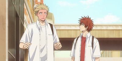 You may have noticed the name I left out there. Last week, I believe I said that Usami is less like a golden retriever and more like an orange cat in his behavior, and he certainly proves it this week. Where the other two are willing to wait until Rintaro feels ready to tell him themselves, Usami just charges ahead like my cat Sammy climbing the curtain he knows he's not supposed to: he just flat-out asks if Rintaro and Kaoruko are dating. And he doesn't just ask; he does it when they're out with a whole group of other classmates who don't even know that Rintaro, Usami, Saku, and Yorita are friends with Kikyo girls. It's pretty much the worst timing ever, which at this point feels like classic Usami. No looking before he leaps for this boy.