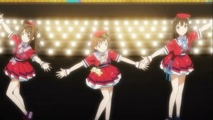 Unfortunately for an episode that is all about a concert, we don't see very much dancing or hear many full songs. The closest we really come are Love Laika's and New Generations' performances, but as you can see from the screencap, those don't always look their best. We do see quite a bit of the group performance at the end, but that shows us snippets of various girls with a focus on easier to depict body parts and moves, such as grasping hands or feet going back and forth. Plus those costumes. I hate those costumes unreasonably.