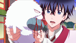 The big plus of this week is seeing the underworld itself. It's even more vibrant than the human world that Abeno and Ashiya inhabit, full of bright colors and a storybook art style for its backgrounds. Most of the yokai denizens are adorable animal creatures, rather than the creepy-cute things we've seen Abeno exorcise over the last few episodes. It comes off as very inviting and easy to get lost in, which is exactly what Ashiya does once he arrives. Ashiya is dead-set on meeting up with "Fuzzy" again. Fuzzy is his name for the white fluffy yokai we saw in episode 1, the one who drained his life energy until he helped exorcise it. Like the viewers, Ashiya took a shine to this thing, in spite of all the trouble it caused him a few weeks ago! Unfortunately, that leads him into trouble when he chases after a Fuzzy-doppelgänger, who also happens to be a thief. It drops its spoils, and a capybara shop owner mistakes Ashiya for the thief. There is seemingly nothing he can do to prove his innocence, not even insisting that he works for the Mononokean.