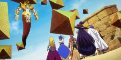 The battle between Togo and Azir is the figurative and literal main event this week and it delivers. Having a Kamen Rider face-off against a Super Sentai team is usually reserved for movie specials and one-off crossovers, so I'm excited to see it represented here. The conflict is a bit lacking in the more technical martial arts component - one of the main draws in the live-action tokusatsu series this is drawing from - which is a bit of a disappointment. Any time Azir and Togo trade punches it's just okay, not great. But the use of giant super attacks and powerful artifacts look terrific and have a lot of creativity behind them. I particularly enjoyed Azir summoning a cloud of spinning pyramids and throwing them at the team only for them to get blasted away by a team-up laser blast. That is precisely the sort of chaotic novelty that makes these series a joy to watch.