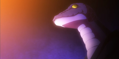 This week's episode of Vatican Miracle Examiner revolves around a scene that's as ludicrous and nonsensical as anything the show has given us so far. Having been bitten by a black mamba, Roberto descends into either an insane vision, an act of spiritual transcendence, or some unholy mix of the two. In this vision, he encounters the anthropomorphic snake demon Atotelus (who I'm pretty sure is completely made up), and he's a lot more dorky and adorable in appearance than threatening. Atotelus confronts Roberto with scales that weigh his flame of faith, which is tested against both a pair of disembodied female legs and a stack of books. I am aware that these things are supposed to be metaphors for the lust for sex and knowledge, but the scene is so self-serious that the whole affair becomes laughable, and I can't help but prefer the idea that poor Roberto is being tempted by the prospect of owning a literal pair of severed legs as well as a pile of rare books.