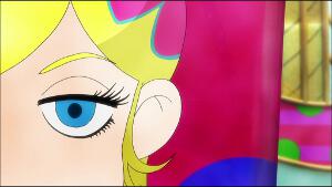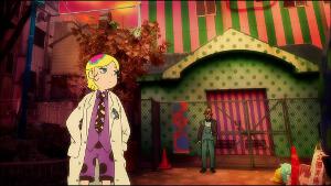 Persisting with this faux-serious turn, footsteps can be heard echoing as a door approaches to the left. The sound is of lonely black leather walking over hard concrete. It's either a success of the show or a failure of this specific, repeated moment that the whole rigmarole feels so ironic: within the context of Irabu's vibrant pallet and oft-deformed and unattractive character illustration styles, such sterility goes down as a jagged pill. It should do – the opening of the door to this office brings with it a burst of light, a huge colourful domed room and a call of "welcome(!!!)" screeches from a voice that would most sensibly associate with a bleach-blond host of a game show that primarily specialises in embarrassing people.
