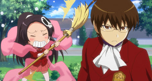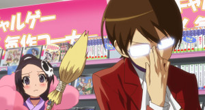 The series breaks itself down into four main arcs, each corresponding with a girl Keima must woo. Much like a game each girl is tougher than the next and Keima has to work harder each time to crack their path to victory. Thankfully he isn't alone in this task. You see, Keima got himself into this whole mess when he accidentally accepted a contract with the cutesy demon Elise to help her capture evil Loose Souls that have embedded themselves in girls hearts. With a magic broom in hand, she'll do just about anything to help Keima out as doing otherwise would break their contract and unfortunately kill them both; and Keima has way too many games to play before he dies. Visually, The World God Only Knows is nothing short of a treat to the eyes. It's colourful, fluid, and rarely appears to cut any corners. Character designs are rather good, although don't expect much originality from anyone but the main cast. Having the show taking place mainly during school hours doesn't help at all in this regard, but Keima's take on the uniform is certainly striking. The series is all but devoid of fan-service, somewhat of a surprise considering the material it is parodying and the content regularly provided in them.