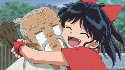 It's a lame resolution to be sure, but fine, whatever — we were bound to get back to the past eventually, since the first episode showed the three half-demon princesses doing just fine in the Feudal Era. At the very least, I figured that the show would do something interesting with Kagome's family meeting her teenage granddaughter for the very first time, and all of the questions that must come from that, right? I mean, Moroha flat out reveals that she doesn't even really know her mother, which has to be a major red flag for Sota, and Mom, and Grandpa, who must want to know why and how Kagome vanished from her own child's life.