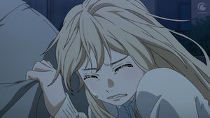 It's getting harder and harder for Kaori to hide the truth about her illness from her friends. She's not only falling down out of nowhere, but also drawing blood when she does. She finds herself bursting into tears for no reason, worrying about if others will remember her after she goes. Her friends, like Kosei, are too gracious to ask her what exactly is going on, but that doesn't mean they're clueless. Kosei's still clueless about other things too, namely that Kaori is developing feelings for him she doesn't have for Watari. It's becoming harder and harder for Kaori to hide her true feelings about anything, and this episode builds until she breaks, leaving it on an ominous note.