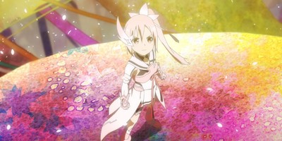In some respects this 2014 production followed a similar path to the one Kyousogiga tread exactly a year before: it was an original anime project which debuted in the Winter season without much buzz, and yet its heavily character-driven story played a key role in it turning out to be one of the year's best series. It is an entirely different type of series, however, and unlike its predecessor, it is not only getting a (relatively quick!) physical release in the U.S. but a deluxe, dubbed one to boot. Categorically, Yuki Yuna is undeniably a magical girl series, one from the more action-oriented, adult-friendly side of the genre. Its closest cousin is Madoka Magica, which it resembles in the tenor of its action scenes, the sense that all of its battles take place in a weird-looking alternate space against truly bizarre-looking foes, and in a grimmer tone and certain thematic elements which are not readily apparent in the four episodes present on this release but are coming for later episodes. The comparisons there only go so far, though, as the cast and approach are substantially different. This is also not so much a deconstruction of the magical girl genre as an expansion of it. Magical girl series often live and die on the likability of their core cast, especially how quickly and effectively their characters endear themselves to viewers, and that is one of the series' greatest strengths. Comments made in included interviews with director Seiji Kishi (My Bride is a Mermaid, Assassination Classroom, Angel Beats!) and screenplay writer Makoto Uezu (My Bride is a Mermaid, Assassination Classroom, School Days) indicate that the project was conceived and designed around the Hero Club members, whose personalities were carefully constructed before the rest of the story was created rather than them being created to fill into an existing story idea. That emphasis shows clearly in how quickly, naturally, and distinctly the characters establish both themselves and their relationships with each other, and explains why the storytelling is so intensely character-driven. Some of the characters have clear models in other sources; Yuna is essentially Akane Isshiki from Vividred Operation but with a pink instead of red theme, for instance, and Fu has some superficial resemblances to Madoka Magica's Mami, though her character (especially the way she emphasizes “girl power” and frets over the way she essentially shanghaied the Hero Club into what could be a dangerous duty) is substantially different. Others, like Mimori and Karin, are more distinct, but all are quickly and eminently attractive in personality; even Karin, the most potentially disagreeable one, is handled in a more endearing and sympathetic way than the normal uppity outsider character and cannot long resist getting absorbed into the group. That their interactions were based on observations of real middle school girls, rather than just pandering to an otaku audience, also shows in the natural flow of the girls' conversations with each other, and the sense of bonding that will become so critical later in the series is already evident. These girls are not just friends for sake of storytelling convenience; they actually feel like they are. The series also breaks new ground with the way it handles Mimori. Characters that are permanently physically disabled from the beginning are rare in anime, especially for core cast members, and in most cases the presence of the disability is not normally visually evident. Here, though, it is steadily present in an unobtrusive fashion. These episodes always show how Mimori's wheelchair is stored when she is not using it and even go into exacting visual detail about how she handles staircases in her school (via a lift built into the side of the staircase) and the transport services available for wheelchair-bound individuals. (A simple, brief scene where Yuna and Mimori are actually shown riding in a handicapped-equipped taxi is a delight.) Most importantly, though, Mimori is never shown as being defined by her disability. She is quite capable in many things and is not really treated any differently for her disability; in fact, the only way it plays a real factor is that it might be influencing her mindset about getting involved with the magical girl side of things. Hence it is no big surprise that she does eventually become a magical girl, too (although the opener plays coy about this by not featuring her in transformed form until after it has happened), but the fact that a magical girl series actually made a paraplegic girl into a magical girl is a truly special and progressive event, one whose implications may eventually go far beyond this series. That Mimori is not shown regaining the use of her legs in the transformation (she instead props herself up with ribbons from her costume and thus makes do just fine) is also a great touch. The day-to-day activities of the girls and their Hero Club are mundane and not always particularly interesting. This is most evident in episode 4, which focuses almost entirely on Itsuki. It may be crucial to her character development and advancement, and to defining more completely her relationship with her sister, but it is also the slowest and weakest episode (comparatively speaking) of the whole series. That is at least partly because it does not have any action component, as the series also shines brightly in that aspect. The three such scenes in these episodes are all active, dynamic affairs characterized by dramatic movements and a smooth sense of flow, scenes easily worthy of being included in any action spectacle. And the best is yet to come on that, as episode 4 ends with the girls preparing to face by far their biggest challenge yet. The series also has at least some sense of humor, though that is more a “fill in the cracks” component than a major aspect or diversion. The production comes courtesy of Studio Gokumi, whose other previous lead efforts (among them A C