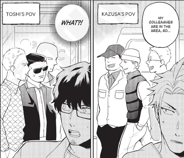 But that's really just the superficial top layer of the story. Toshi is a nail artist, and he's faced plenty of criticism for being a thirty-year-old man in a “girly” profession, beginning all the way back with his father, who also physically abused Toshi's sister Riko for daring to be a lesbian. Toshi now operates a “nail corner” in his sister and her partner's café, and even though he's making his living through his manicure skills, he's still uncomfortable letting people know. Kazusa, meanwhile, grew up without his dad, and his mother coped with her grief by becoming a serious idol fan. That's not to imply that she ignored him, because she didn't, but he's not quite sure how he's “supposed” to present himself or act. This leads to the only real misunderstanding in the book: when he and Toshi first meet up, he dresses up, which to him means “as gaudy and flashy as possible,” leading Toshi to assume that he's a yakuza. Whoops.