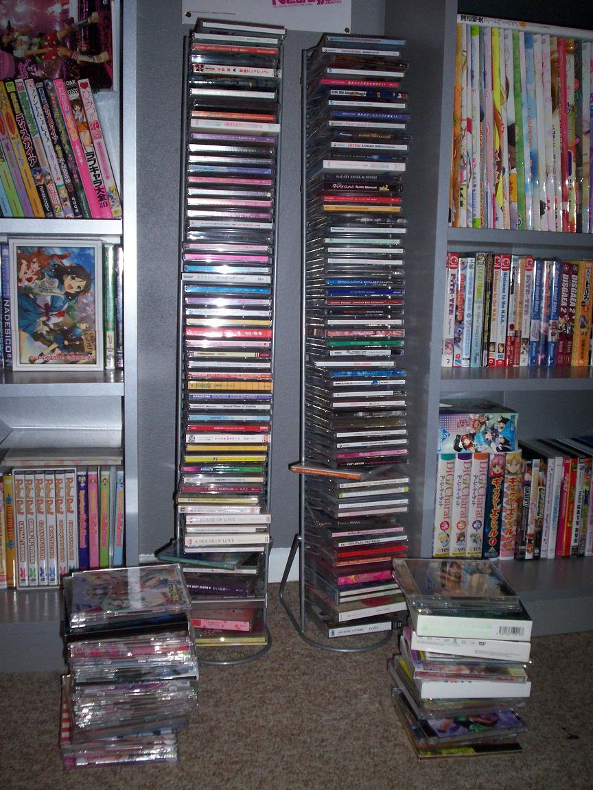 I have about 350 DVDs, 80 manga, and 150 anime related CDs in my collection. CDs are mostly imports (about 90%). Of course, absolutely no bootlegs.