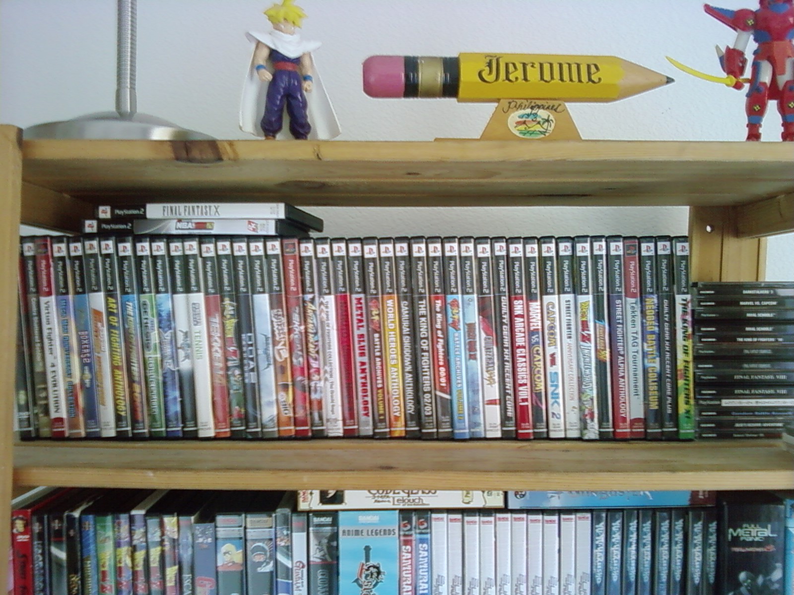 My Top Shelf showcases what I feel is a definitive PS2 fighting game collection, at least as far as US releases are concerned. From Street Fighter to Samurai Shodown to Fatal Fury to King of Fighters to World Heroes to Guilty Gear to Arcana Heart to Naruto Ultimate Ninja to Dragon Ball Infinite World to Tekken to Soul Calibur to Dead or Alive, I pretty much have it all!!! My PS1 collection is to the right, which includes such rarities as Darkstalkers 3, Rival Schools, JoJo's Bizarre Adventure, Gundam Battle Assault 2, Marvel vs. Capcom 1, and an original Japanese release copy of Dragon Ball Z Legends.