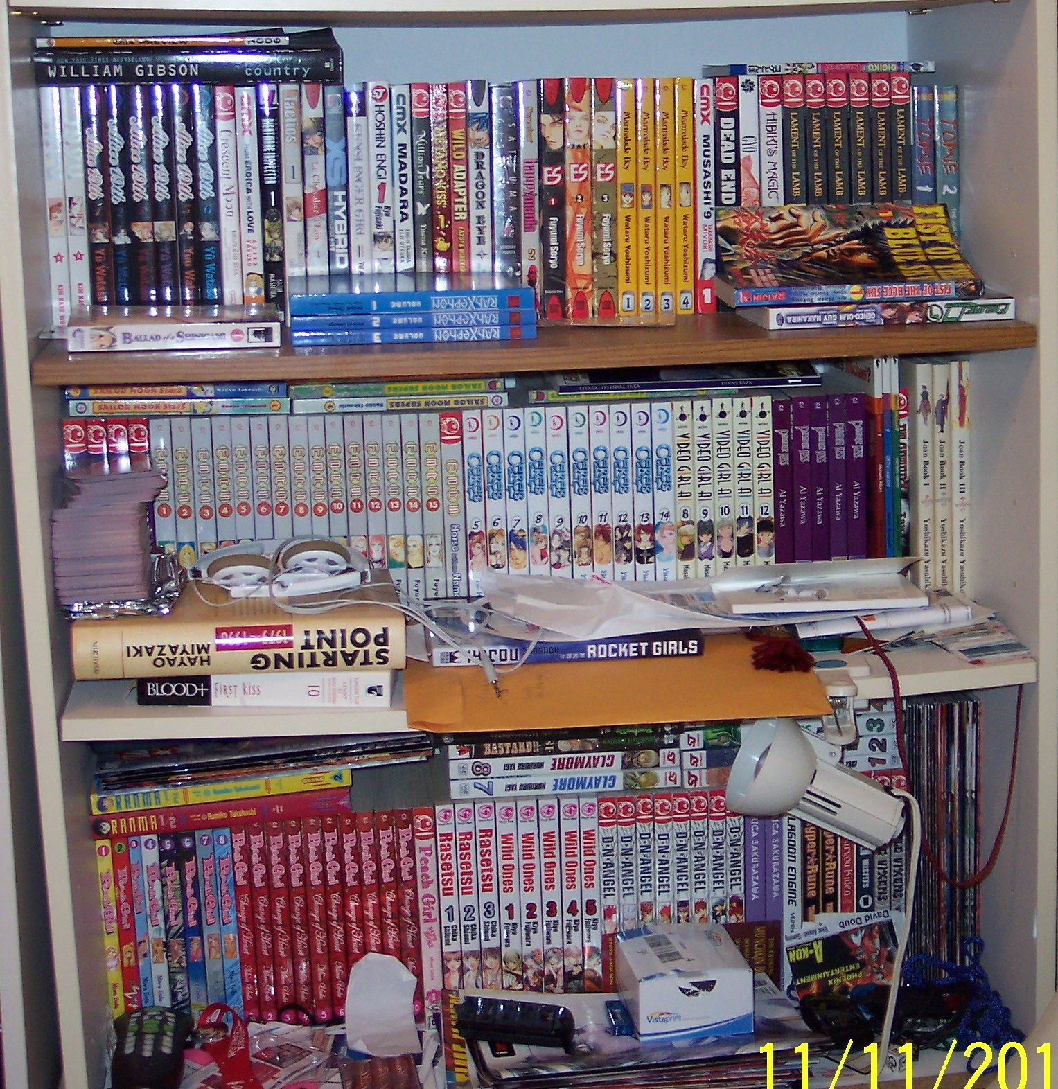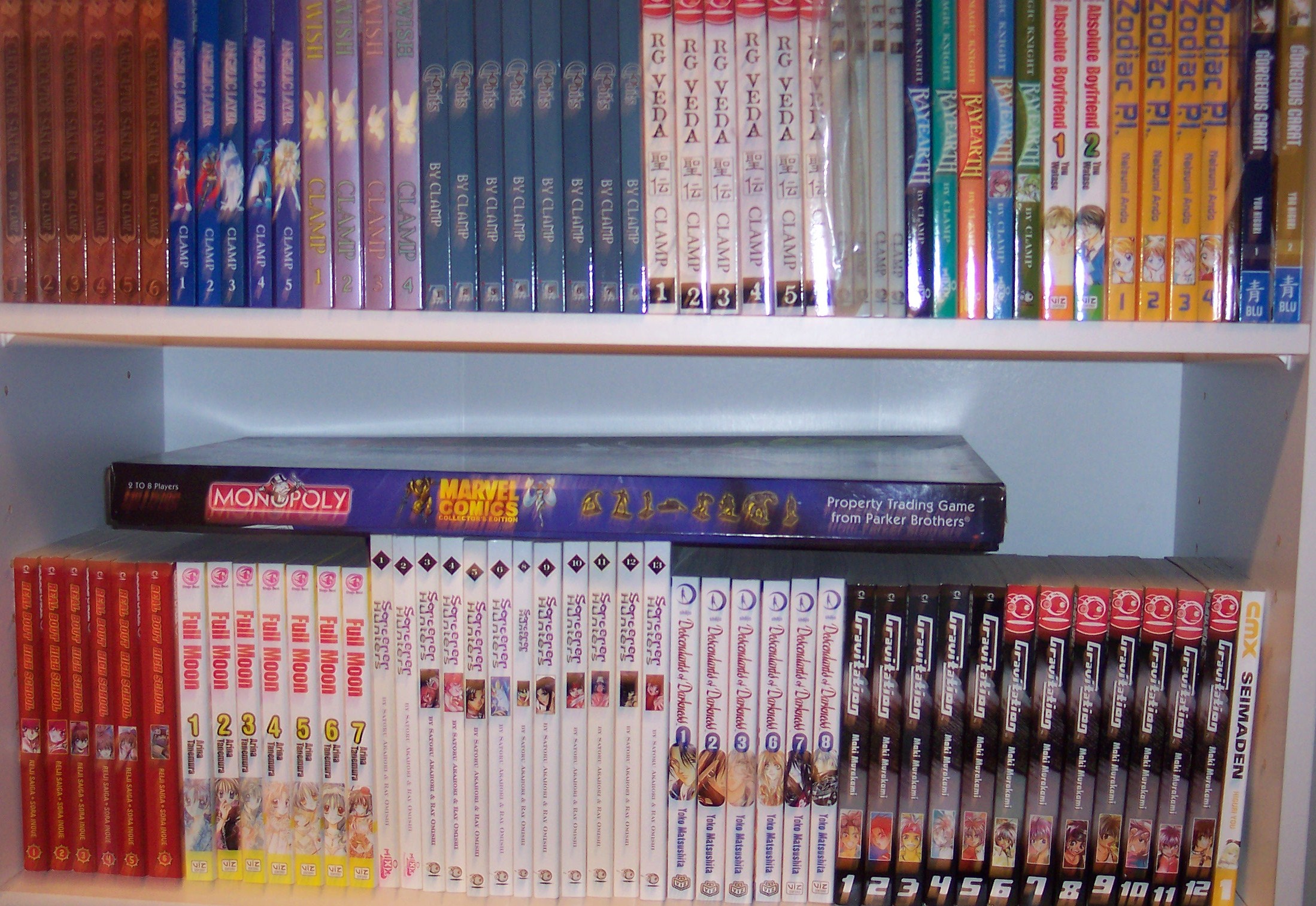 In the first 3 pictures you can see my one bookcase that mainly has manga from a bunch of Clamp ones to some in raw Japanese. Also the bottom shelf is my whole collection of Heavy Metal Magazine from the 1990s to current.