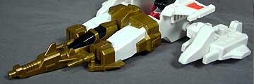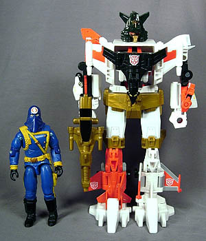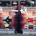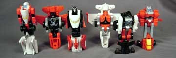 This set has an interesting history. Originally, these toys were sold in Japan around 1992 as a box set called Sixwing. In 2003, it was reissued but instead of a gift box for kids, it was released as a set of trading figures that were Destrons (Decepticons) and "evil" in color--purples, greens, blacks, and so forth. A "chase" version was released called Sixwing Berserker, an all-white Autobot. There have also been many bootleg toys based on this mold which can still be found at Wal-Marts, Kmarts, Big Lotseses, and other such stores.