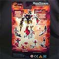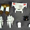 When transformed, each figure has a few moving parts-- like arms that move a little, or a unified "unileg" which allows limited movement. Many of the robots have a tiny hole in the bottom of their feet, which is used when making Superion or for placing the figure in the "jet mode" of the spare parts. (More on that below.) A lot of the figures are named similarly to the original Superion, a team of robots from 1986 which featured five members. (There was no Ro-Tor or Storm Jet in the original, but there was a Slingshot, and they were all colored very similarly to this set.)