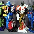From left to right: Constructicons (Devastator), Protectabots (Defensor), Aerialbots (Superion), Railbots (Rail Racer). All of these others were also based on older, once very-hard-to-find toy sets which were later reissued as trading figures which eventually were modified and sold in the USA as Kay-Bee exclusives. As you can see, they (mostly) all use the same basic elements to form many pieces, although they all have unique heads and hands.