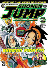 Released by VIZ Monthly Anthology $4.99 U.S. With Hikaru no Go premiering last month, Shonen Jump is moving away a bit from the hack and slash style series that marked its beginning. While fans were thinking that the more action packed Rurouni Kenshin would take over the slot from Akira Toriyama's Sandland, Hikaru no Go is moving quickly to establish itself with the other heavy hitters of the Shonen Jump anthology. Hopefully Viz will take notice of the popularity of Hikaru No Go and take more chances in the future with the mix of series. Not everything needs to be a Dragonball clone. With the new series running well, Shonen Jump remains one of the best anthologies in the North American market. As for the rest of the titles this month, they are all in the middle of major story arcs. Fans of Shaman King also get a nice extra in the form of an interview with Hiroyuki Takei. Viz continues to pack in value with a nice slew of extras and feature columns, helping to draw in fans to monthly anthology. The only downside at this point is the annoying one-liners at the bottom of most pages encouraging fans to go by the graphic novels. Keep that up, and I will go get the novels, and stop picking up the monthly mag! |