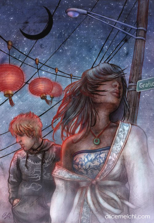 Alice Meichi Li: I wanted to have a connection between Endymion and the previous painting I did with the same characters, Luna. The picture is based on a Greek myth. The girl in the picture is Selene, the goddess of the moon. The mortal man is Endymion, Selene's lover. The previous work was full of pinks and reds, and so I wanted to link the images through the colors and depicting the same previously blooming flowers now transformed into a humble sympathy bouquet. I wanted to show that the love and warmth from the previous painting still had an impact and drove the story. Since she is a goddess of the moon and rules over the world of the unconscious – sleep, dreams and the like - she puts him to sleep so that he can be with her in his dreams.