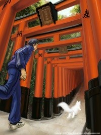 HT: The thing I like about Japan is that with all its new technology and its giant urban metropolises, right next door you can easily find a temple that dates back hundreds of years. My illustration of Fushimi Inari is mostly based on my personal observation of seeing a few high school joggers training at the shrine when I first visited. In addition to that, however, I wanted to do something that shows how Japan has become this place where modern everyday life has blended with the country's ancient history, thus the jogger running after the Inari fox god. Some people have mistaken the fox in the picture to be a cat, which also kind of works too because we also did see a pretty handsome white tomcat while we were there. He had one blue eye and one gold eye, and he was super friendly. More impressive was the fact that he sported the hugest set of balls I've ever seen on a cat! I mention this only because it was pretty hard not to notice them.