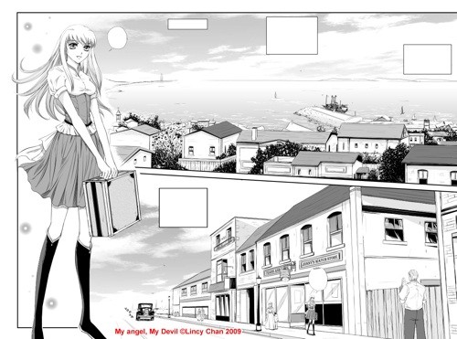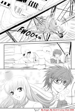 Lincy Chan: My Angel, My Devil was originally created as a general submission [to publishers], but I made it to a short story for Rising Stars of Manga 5 back in 2004. It's about a normal high school girl who has the ability to see evil sprites through a camera lens. She's protected by her guardian angel and devil from the attacks of demons. It made to the top 20 for the competition and was put aside until I decided to work on it again last year. I keep the title and characters the same, but I changed the setting to a completely different story. This time, the story will be a fantasy/sci-fi story set around the 1920's, in a world of aviation and magic. I also added in steampunk elements for the character and world designs. The story is about a group of people wgo try to invent a plane that can fly higher than the sky with the power of science and magic.