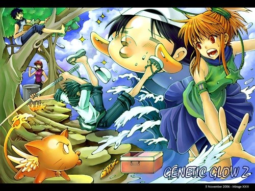 Although both Diane and Elly continued to produce their own artwork, it wouldn't be long before a class assignment for Elly to produce a flash animation would become their first project. Elly was determined to make her own game, and although Diane was skeptical about her own artistic abilities at the time, she offered to help Elly create the game she was trying to make, tentatively titled Genetic Glow. As a result, Elly helped train Diane on the ins and outs of Photoshop and other techniques used to design art on the computer. In return, Diane helped Elly brainstorm ideas for the game story, characters, and images. In the end, Elly took care of the character designs and stories for the characters while Diane handled image designs and coloring. While both artists admit that Genetic Glow had flaws, the project was enough to inspire them to continue designing games in flash and experiment with other game platforms. Elly and Diane brought the characters from Genetic Glow back for a sequel, which they also did together. As Elly strengthened her skills with flash animation, Diane found that her drawing and design skills were also improving. As a result, she took the lead on a new game series, Imaginary Realm, for which she handled the character designs and storywriting.
