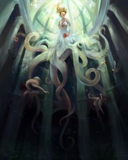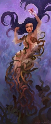 Even with a quick glance at Schin's work, you can see just how much effort she has put into bringing fantasy aesthetics and the "shōjo" look together in her work. In her universe, doe-eyed heroines and monster-like features occupy the same space, which allows her work to be interpreted in a number of different ways by the viewer. In a recent series of pieces entitled The Monstrosities of the Femme Fatale (see Love and Lies and The Ascension, both displayed on this page), Schin focused on combining "pleasant" images of female figures with elements commonly associated with monsters, evil, and danger. While some of the symbolism behind elements like snakes can seem obvious, Schin designed the works in the series with a more detailed interpretation in mind. In the case of Love and Lies, "snakes can be cold and reclusive, but it is also their nature to look cool," says Schin. She also notes the differences between how the female character and the snakes are reacting in the work. "[The woman] in the image is emotionless, but the other side of her is full of life." The level of detail Schin put into the Monstrosities series reflects another key ingredient in all of her work: a storyline. "All of my current paintings have a back story," says Schin, "but I keep it vague, so the viewer can create their own visions and stories to go with the image."