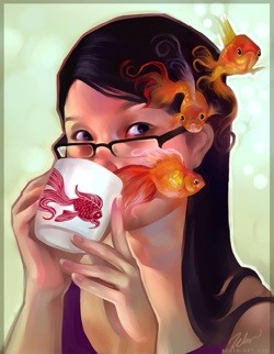 Schin: I did NOT want to do a self portrait - I did one previously and thought that was enough. But we were given an assignment to do another self portrait, and I tried to dodge having to paint myself again by covering half my face with my hands, an umbrella, a mug etc. It didn't look very interesting, and half-asleep at 3am, I doodled a series of thumbnails upon those ideas and eventually fishes, octopuses, Butterflies, Flowers and puffer fish were floating out of the mug. The next morning, I looked in the sketchbook and I was like, wait what? But I painted it anyway and to my surprise, it was well received.