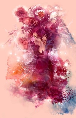 Schin Hern Loong: Sweet Roses was one of two paintings (the other one is called Opening Light) commissioned by my friend Uennie three years ago. These two paintings were done for a breast cancer awareness event by her online breedables shop Vale of Earth on [social website] Gaia Online, and I was asked to paint a woman with a rose theme. I tried to incorporate a lot of brightness, love and hope into the character as well as reddish pink colors, which were the colors of the breast cancer awareness groups. I still love these paintings very much until this day, as for me they represent something more than just a beautiful woman. As a promise to Uennie, every year I donate 5% of the profits from each of these prints sold to the Susan G. Komen foundation.