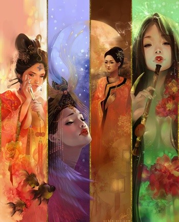I consider The Four Beauties to be the most developed of all the three paintings. Woody Allen was a sort of funny story, and My Mug had a fun concept which I just polished, but the Four Beauties do not wholly belong to me as they are four legendary women of ancient China who are very famous, and I know that many people know their stories better than I do. Before starting on them, I did plenty of research and read as much as I could about them and in that way, subtly hint to their back stories within their panels using the way they pose, their backgrounds, the colors, and random elements like goldfish, feathers, moons and why the fourth woman is naked (according to legend, she likes to take baths). Thusly I try to encourage all who like this painting to read their back story, as I feel that it adds more weight to the painting. However, it is fine as well to just see them as women representing the four seasons, as I know that not many people know about the four beauties.