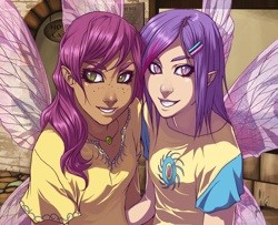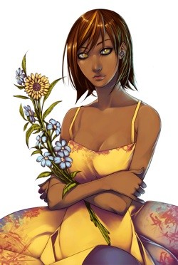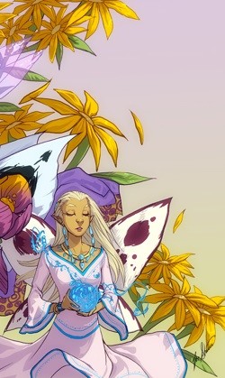 Ms,Shatia is quick to credit her commission work for helping her develop her style beyond what it once was. Expressive eyes and facial features are still central to most of her work, but instead of "over thinking" the look of an entire piece as she once did, Ms,Shatia is more comfortable now with beginning a piece with a face or expression and working the rest of the detail in afterwards. "I want to make my pieces more dynamic," she says, "more than just character modeling and poses." Her genre of choice remains fantasy, as evidenced in her use of flowers, sweeping green vistas, and other nature-related elements. "I don't get out much, so I like to represent Mother Nature in my work as if she was a character," says Ms,Shatia. In the interest of bringing the theme of nature together with the desire to draw more than simple character poses, she began working on a webcomic called Fungus Grotto that puts the two elements together but features characters inspired by personality types that she observes in the real world. Although the color in her work is digital, Ms,Shatia still does the majority of her first sketches in pencil. "After high school, I couldn't be at home as much because I had to work at my part time job, so I would start pieces on paper wherever I was at the time," she says, adding, "I think when everything is done digitally, it ends up a little too clean looking and you lose those 'quirks' you get from pencil or real ink."