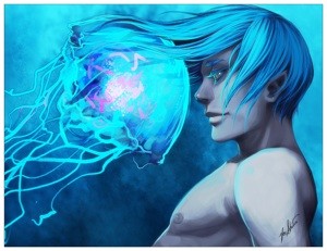 My inspiration for Face to Face played on the idea of coming up close and personal with something that had no unique facial features but it's very unique looking. I'd mentioned my favorite part of a piece is the character's face. I tend to associate faces with personalities. For me, it's in the eyes. You can usually tell who the bad guy in an anime is just by looking at their eyes, right? Obviously the face means expressions, and jellyfish just can't make any. Azure, the 'man' in the picture, has some pretty interesting things going on. You know he's not quite human, but he's sort of overshadowed by the blob floating by him. I've had nightmares about running into really giant jellyfish in really dark, almost black ocean water. I thought they were after me and in my desperation to get away, I found out they didn't even care I was there. I thought it'd be cool to see how this powerful looking character would react to one he came across. This jellyfish was brave enough to get all up in Azure's personal bubble. I wanted the viewer to feel like they were facing off. I think jellyfish is as blind as it looks and doesn't know it's literally staring in the face of death... They're both lethal creatures, so there's a slight air of hostility and I hope it left people wondering who'd win in a fight. (laughs) I also tried to make it feel gentle. Azure could just push the jellyfish away but he's not afraid and has the nonchalance of someone totally not caring that the jellyfish could snatch him up and give him the shock of his life. There's no reason for him to doubt he's more powerful than this glob harmless looking of jelly...