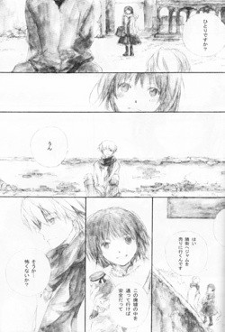 I hit the floor with an open mind, eager to pick up a little of everything to get a good variety of reading material. It would be inaccurate to say that everything at Comitia was pure gold; there were more than a handful of artists that clearly need to keep trying to refine their style. My first acquisitions included a small gag manga about a living donut who makes a living by working at a donut shop, a manga anthology centered around the theme of food, an illustration book that follows a group of High School Girls forming their own band, a science fiction story set in a future where the city of Tokyo flies above the Earth, and many others. I also brought a sketch book to the floor, since a handful of artists at every dōjinshi event in Japan will usually be willing to sketch something for you for free. The creator of the story about Tokyo has agreed to let me publish her sketch here, which she graciously did in color. It can be a lot of work for an artist at the show, but for many artists, it's just another way artists are accustomed to showing their appreciation to their customers. "I usually fill up on sketch books fast," said the author as she sketched my work. "Even though it is work, it's more fun to do this than just sit here and sell things."
