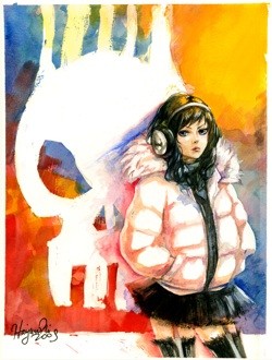 With a traditional take on colors but a manga-inspired flair, Hanjun's work exudes a charming simplicity that reflects her view of it as a hobby, but also speaks to the training, practice, and effort that has brought her this far. Her small, cute "squishies" are simple, yet colorful and memorable. Her original work, however, reflects a wide swath of inspirations in its painterly, traditional-meets-modern style. In fact, Hanjun credits masters like Alphonse Mucha, Norman Rockwell, and JW Waterhouse just as much as she credits manga for inspiring her. "Most of all," she says, "the most influential artists in my life are friends who I can look to for advice." In creating her original work, Hanjun usually refers back to notes or sketches based on ideas or inspirations. These can range from a saved image from an online picture chat, a doodle in her class notes, or sketch thumbnails. "Once I decide I want to paint something," says Hanjun, "I try to picture a specific color scheme, lighting, or some other element that I want to include and design it from there." Despite working with and being surrounded by digital art, her roots in more traditional art training still lie at the heart of how she produces her work: "I don't use layers much in Photoshop; I typically work with random colors [on one layer] until I am satisfied. Digital formats make it easy to change colors, but I still like the feel of watercolors." Most importantly, regardless of what format she uses, Hanjun's focus lies in producing a piece that will resonate with her audience and look good if and when it is displayed publicly.